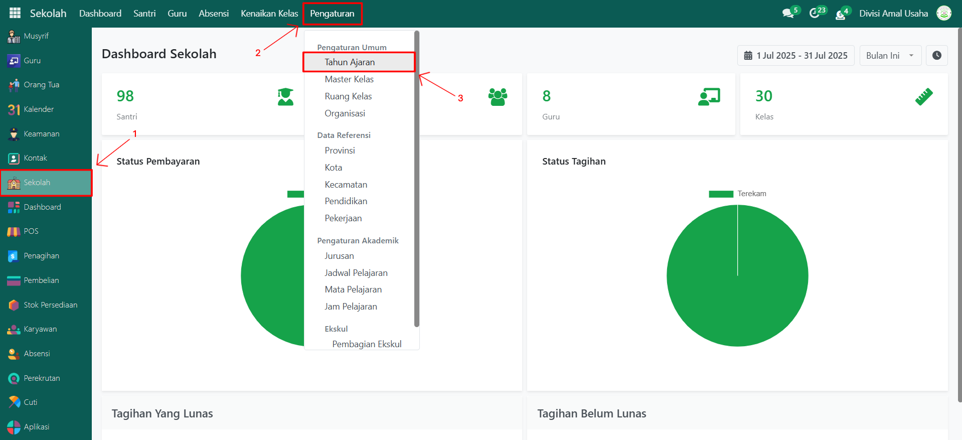 Tahun ajaran yang dipilih kini sudah aktif pada induk perusahaan, sehingga akan otomatis menjadi acuan utama dalam modul akademik, keuangan, maupun kegiatan operasional lain di pesantren.