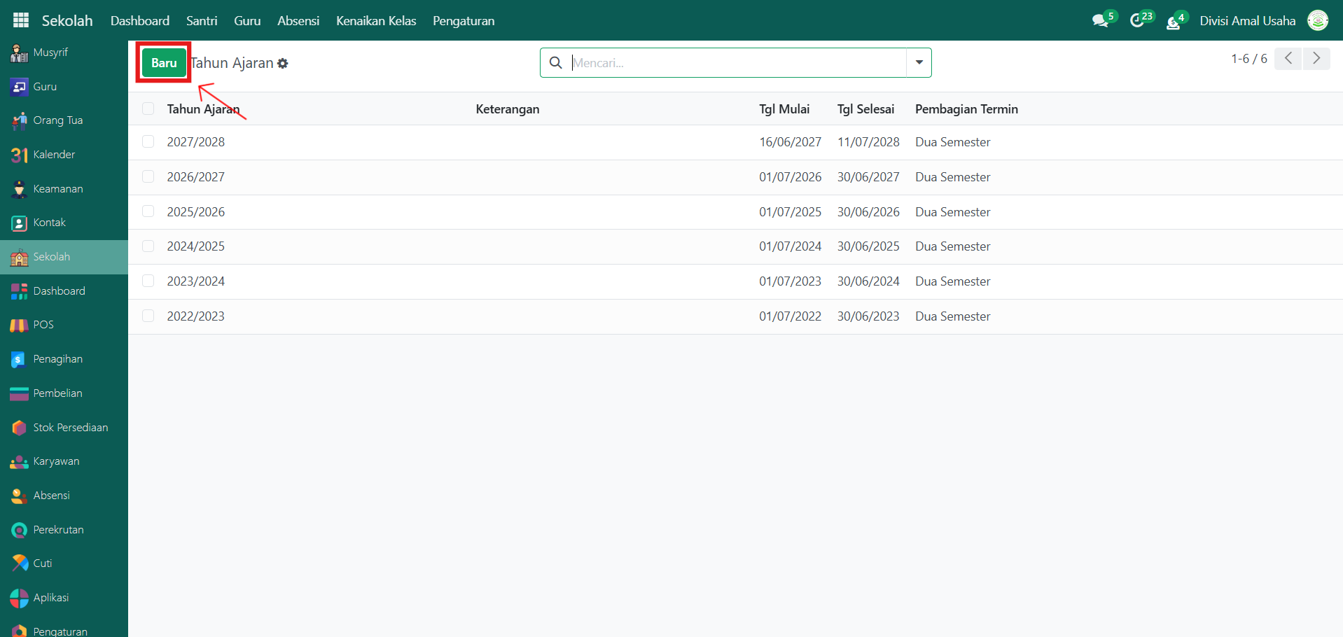 Klik tombol “Baru” untuk membuat tahun ajaran baru.