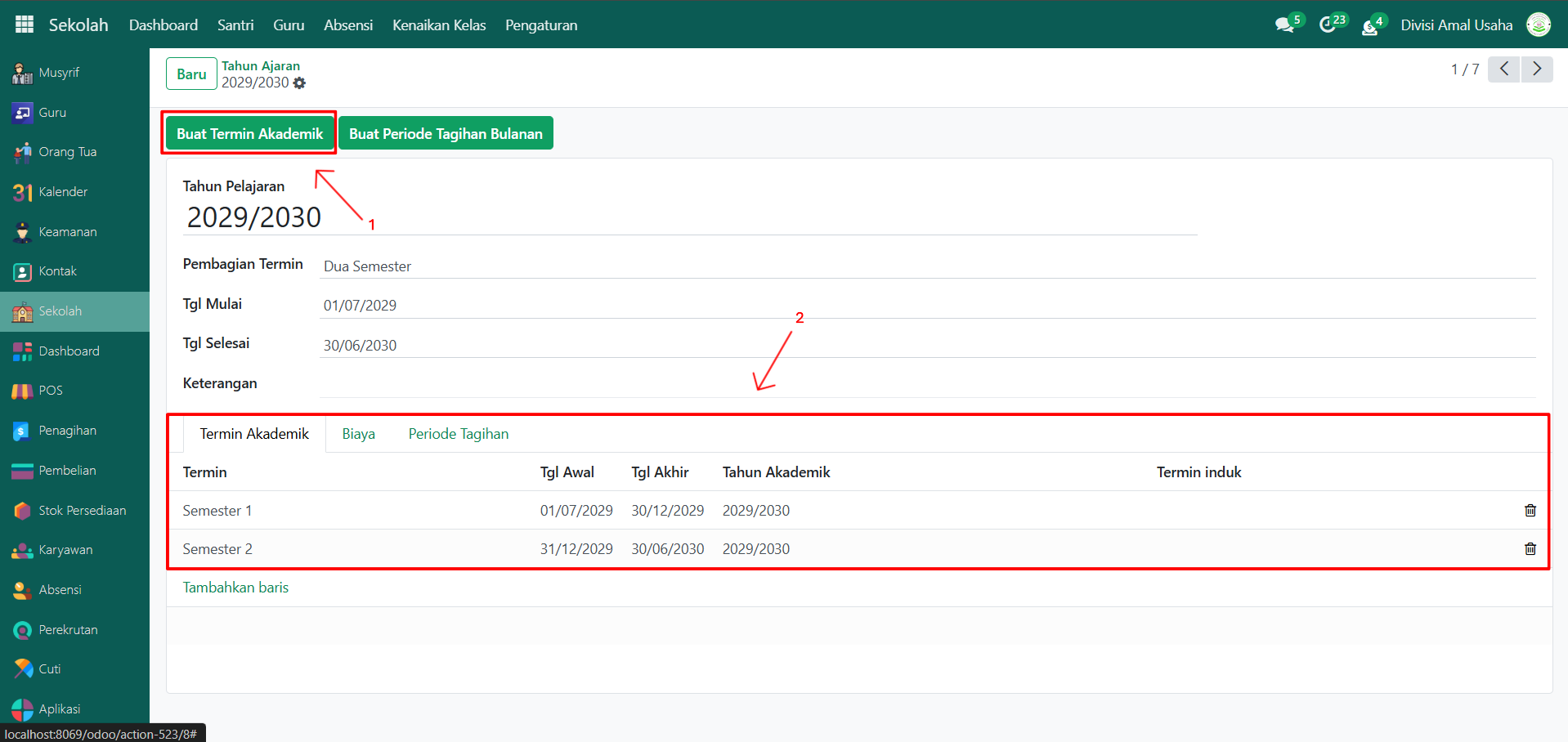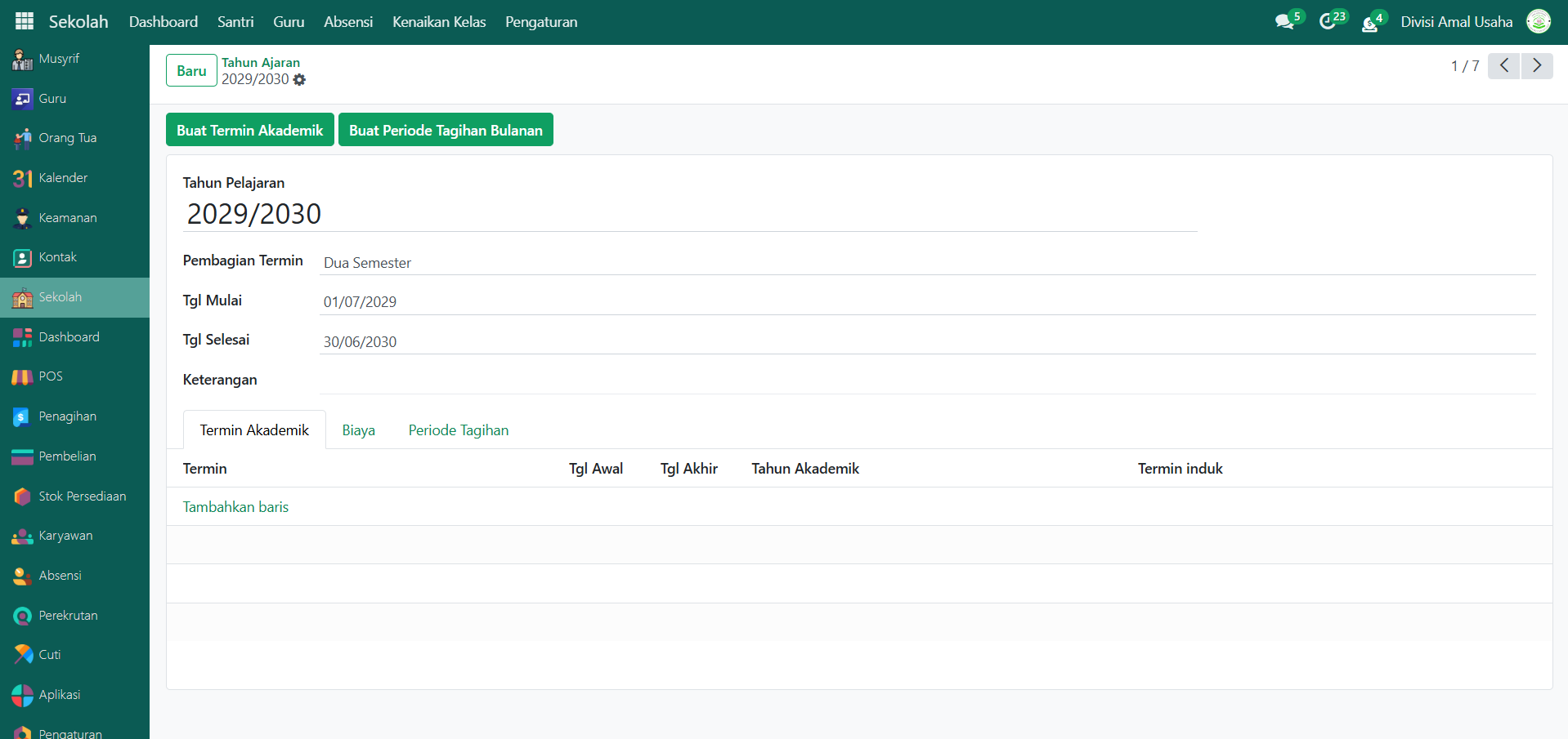 Tahun Ajaran pada Odoo Pesantren digunakan sebagai acuan periode kegiatan belajar mengajar. Dengan adanya data Tahun Ajaran, sistem dapat mengatur jadwal akademik, periode tagihan, serta termin pembayaran sesuai dengan waktu yang berlaku di pesantren.