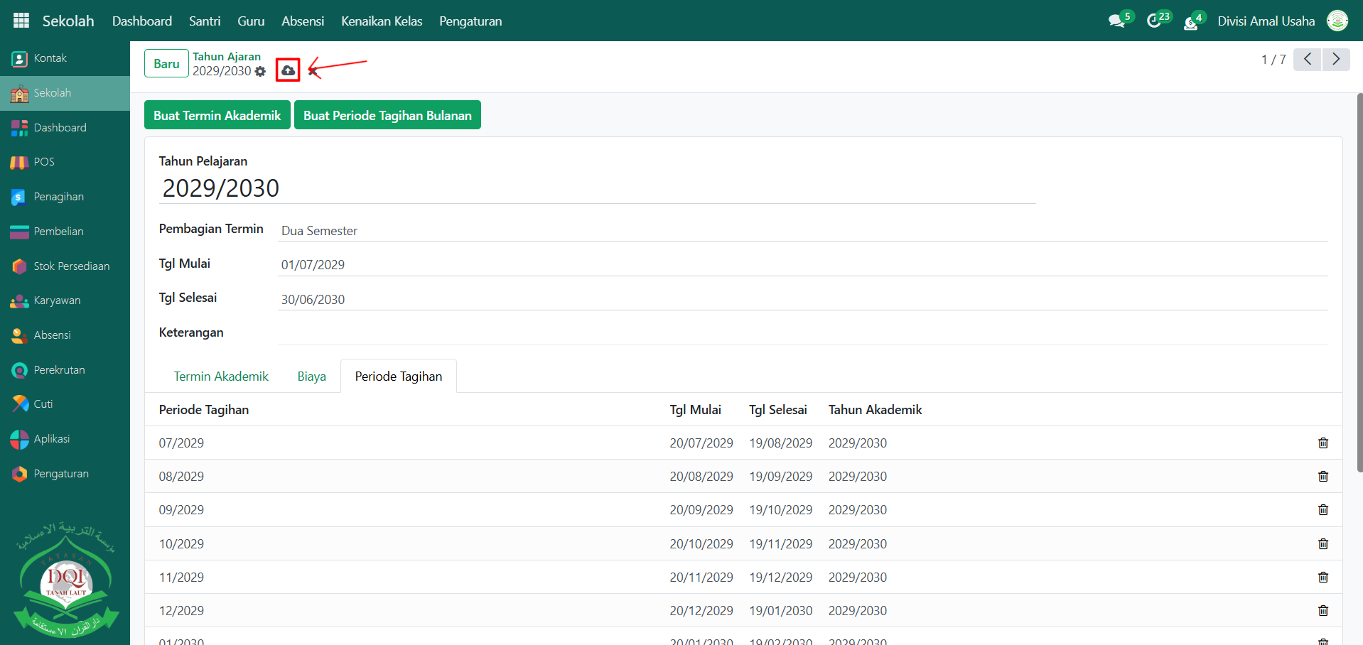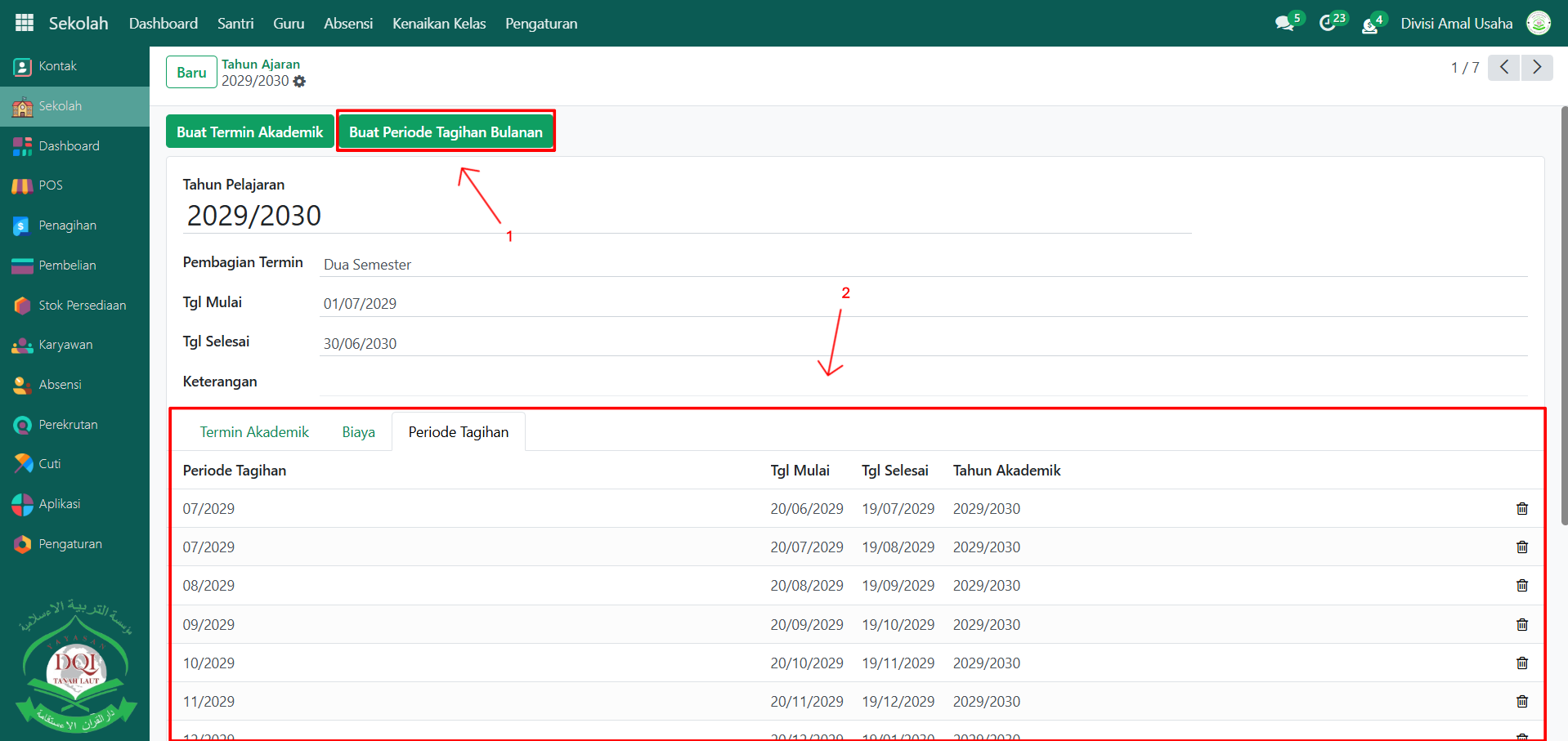 Kemudian klik tombol Buat Periode Tagihan Bulanan untuk membuat daftar periode tagihan bulanan sesuai tanggal tahun ajaran. Data ini akan muncul di tab Periode Tagihan.
