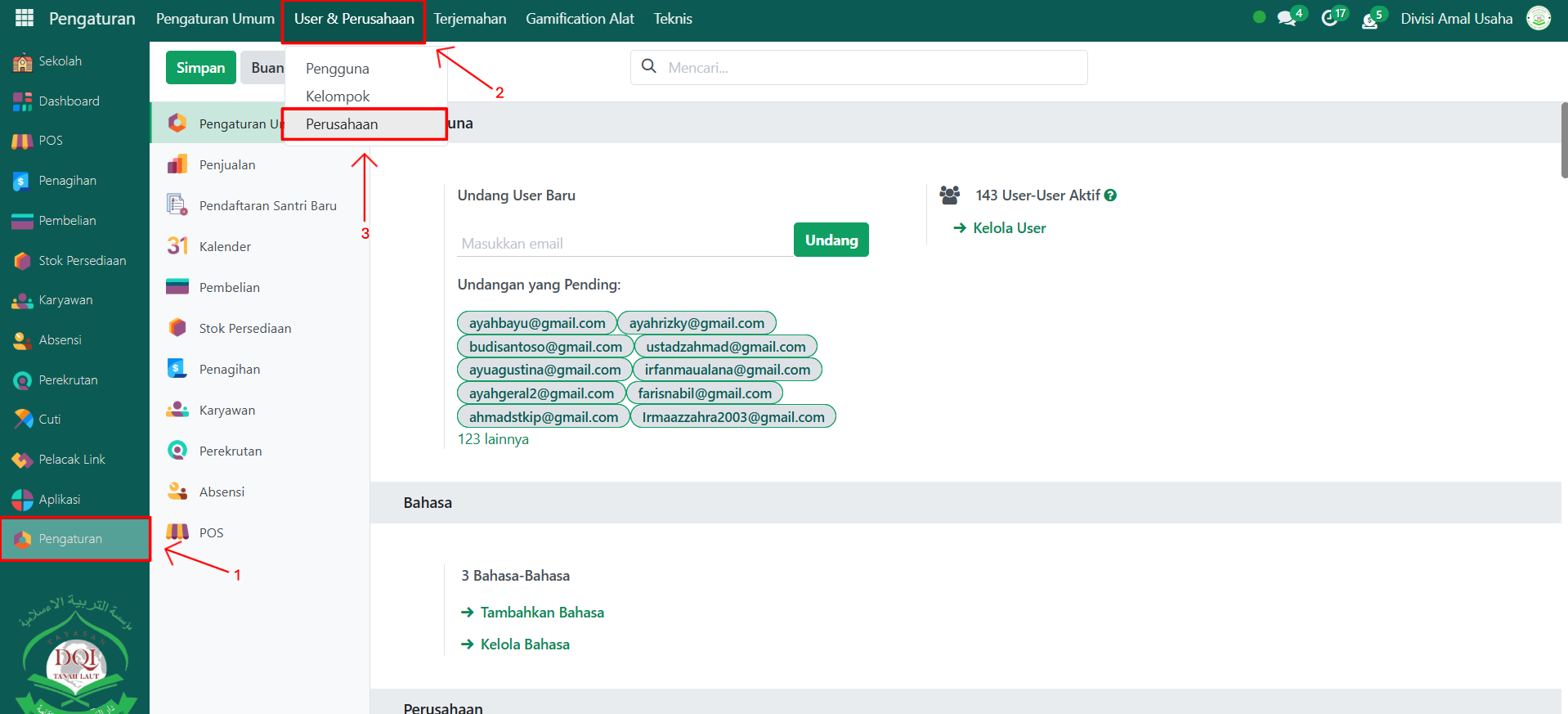 Buka menu Pengaturan, lalu klik User & Perusahaan dan pilih submenu Perusahaan.
