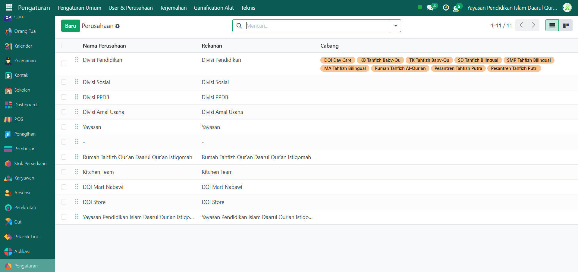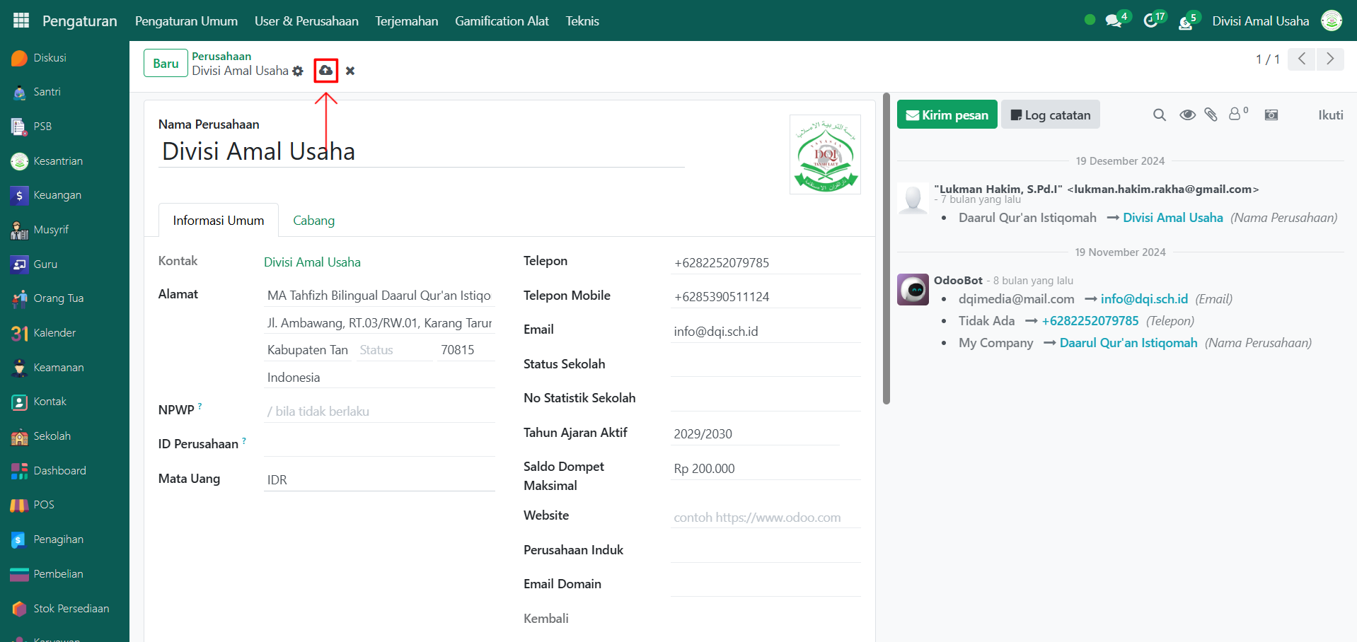 Agar tahun ajaran yang sudah dibuat dapat digunakan secara aktif di seluruh modul yang berhubungan dengan akademik dan keuangan, perlu dilakukan konfigurasi pada induk perusahaan di Odoo Pesantren.