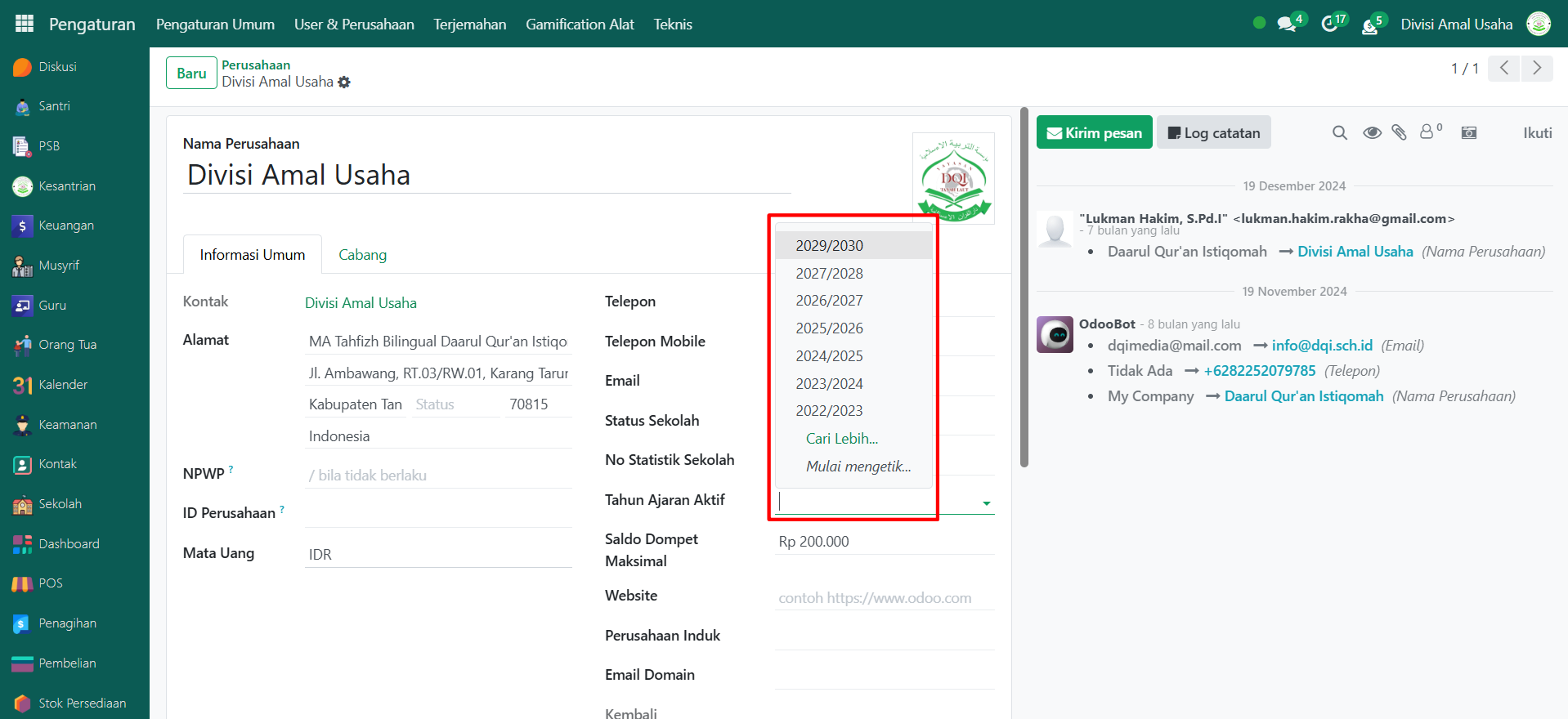 Pada halaman form perusahaan, cari field Tahun Ajaran Aktif, kemudian pilih tahun ajaran yang telah dibuat sebelumnya.
