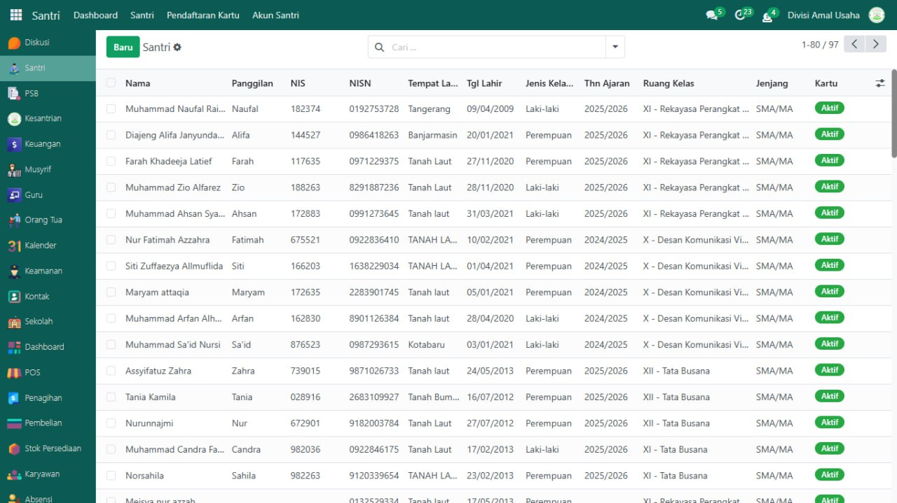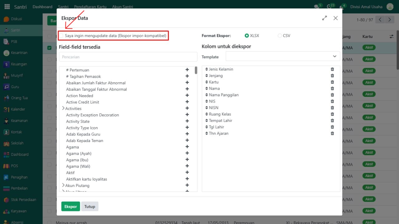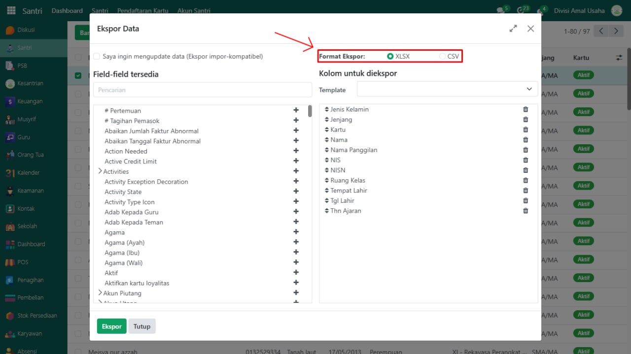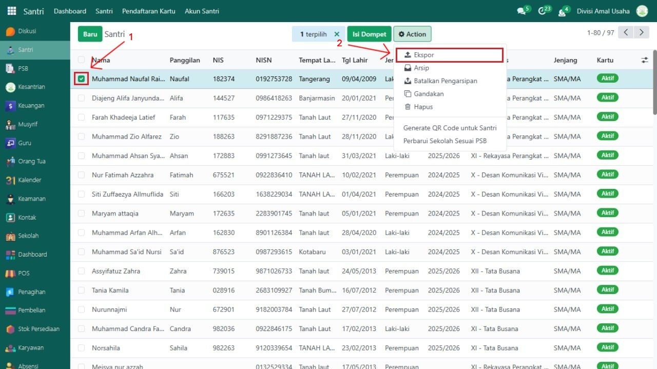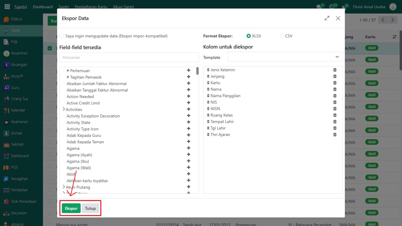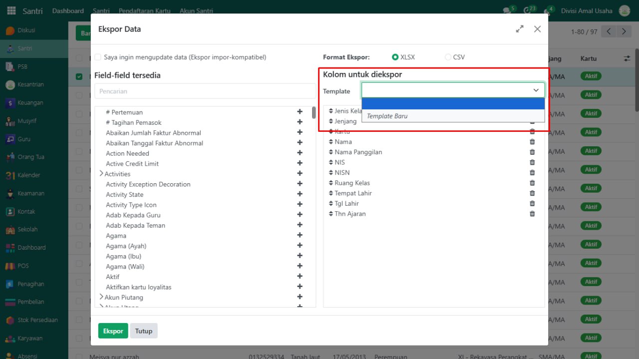 Buka modul yang datanya akan di ekspor, misalnya pada data Santri.