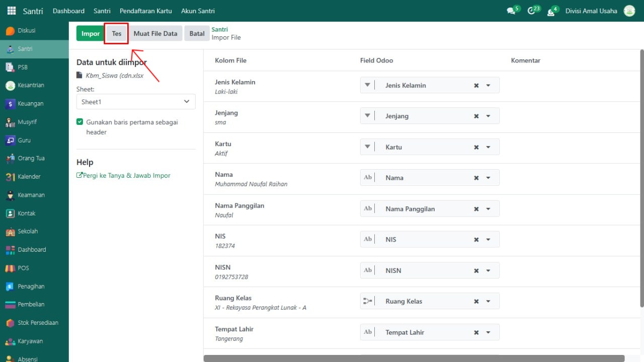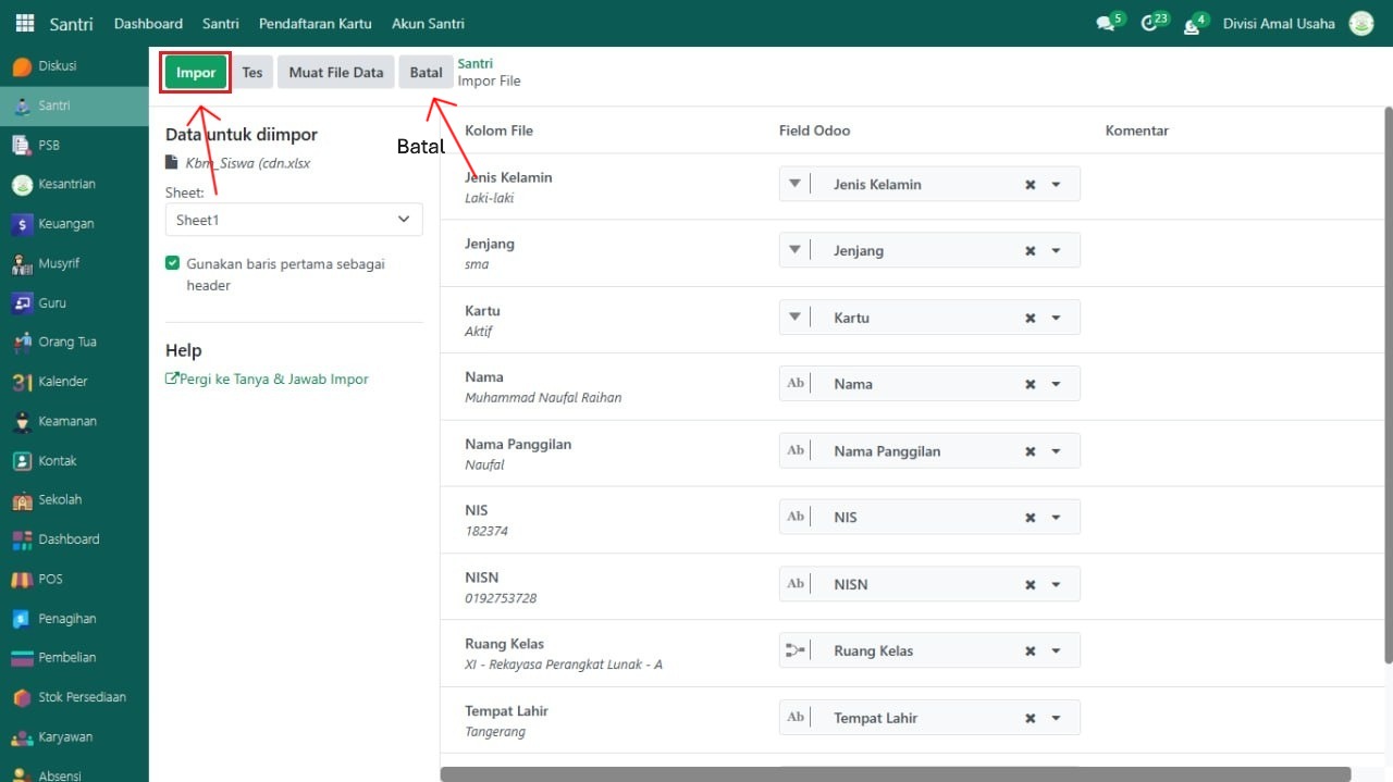 Berikut adalah langkah-langkah melakukan impor data pada Odoo Pesantren.