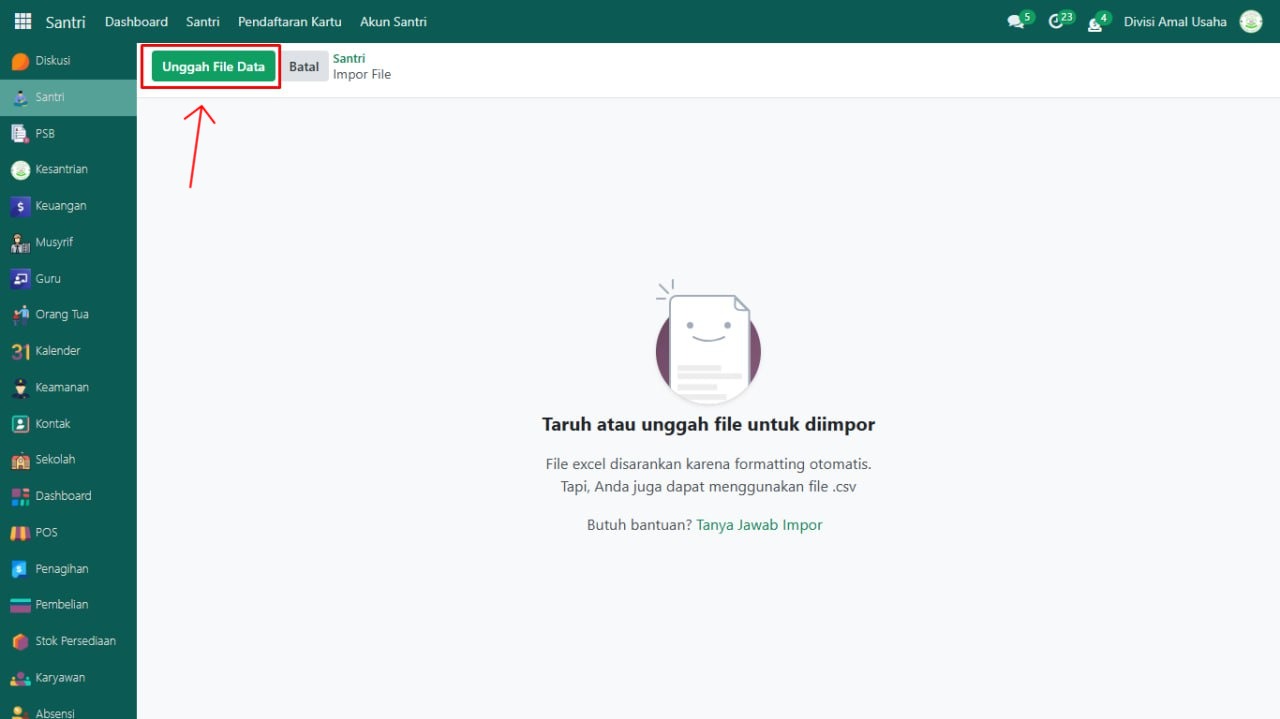 Buka modul yang akan di beri/impor data, misalnya pada data Santri.