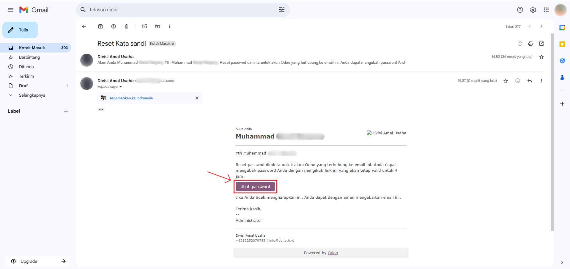 Masuk ke akun email Anda, lalu cek email instruksi reset password dari Odoo Pesantren, setelah itu klik tombol "Ubah Password" pada email tersebut.