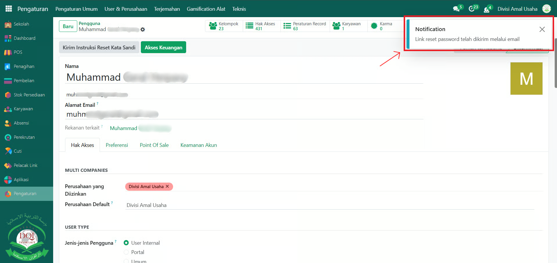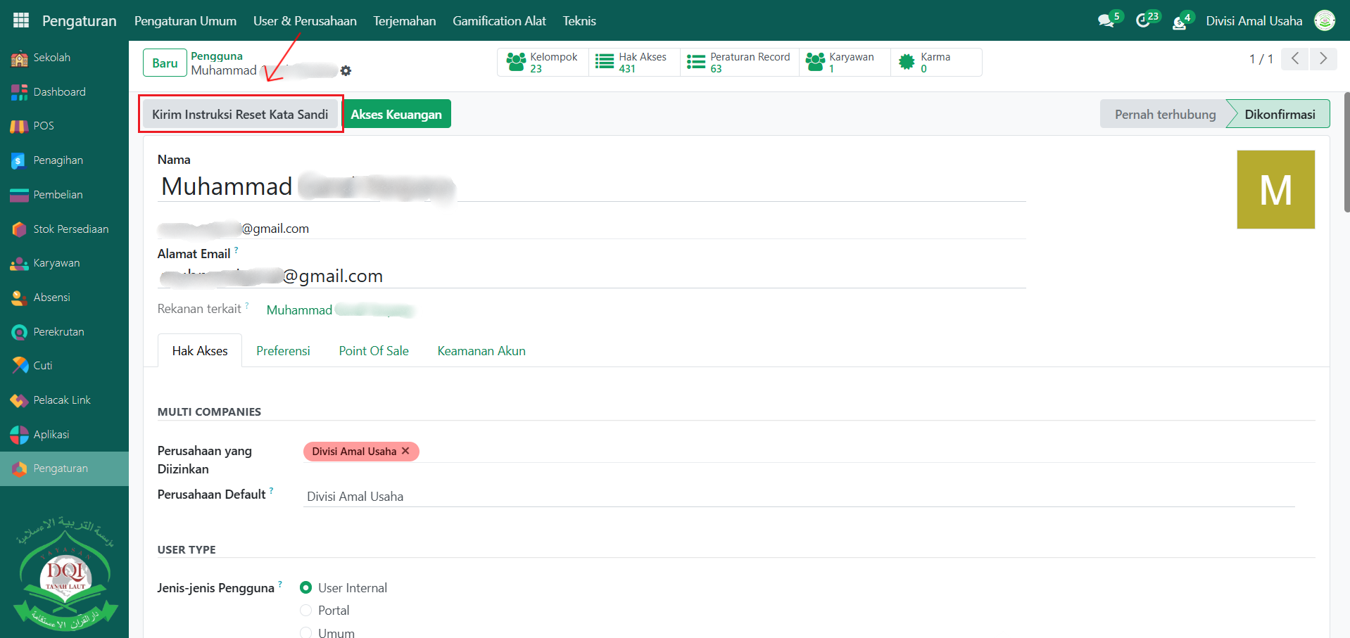 Berikut adalah langkah-langkah cara melakukan reset password via email dari administrator pada Odoo Pesantren.