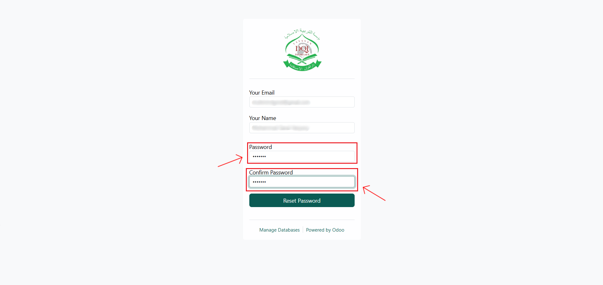 Anda akan terarahkan ke halaman reset password Odoo Pesantren lalu masukkan password baru Anda dan konfirmasi password baru. Setelah selesai memasukkan password, klik tombol "Reset Password" untuk memproses reset password oleh sistem.