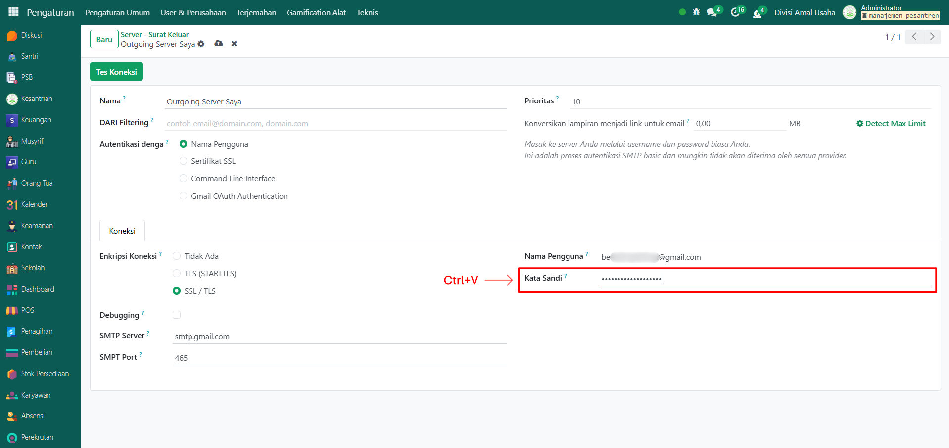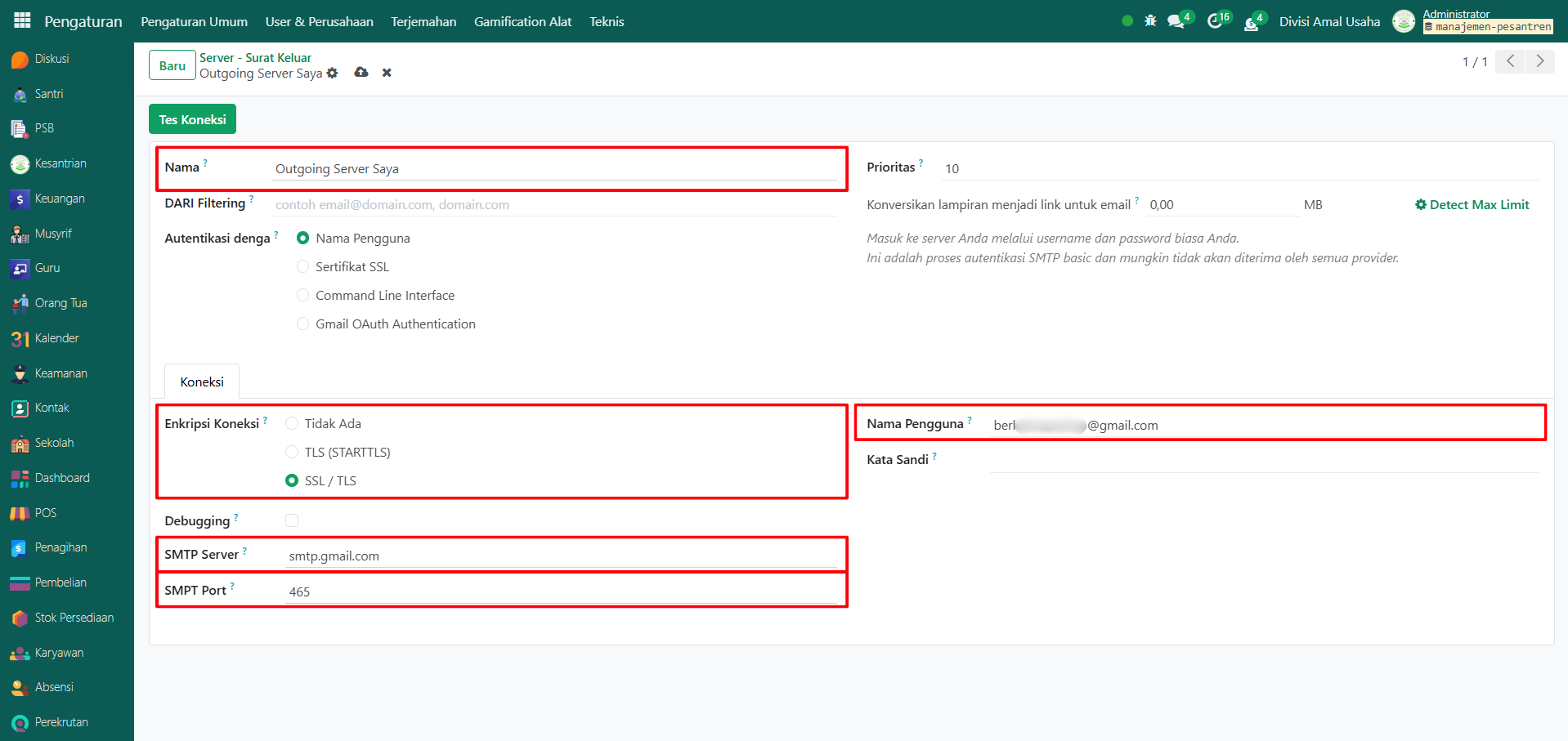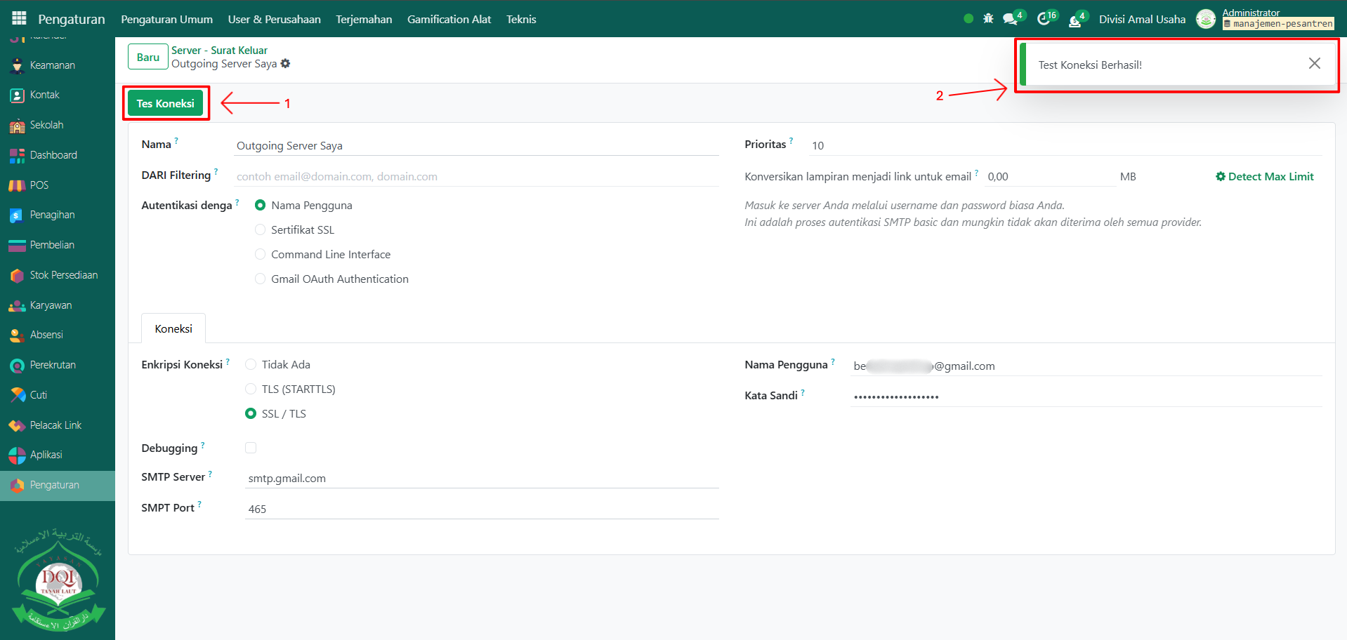 Berikut adalah langkah-langkah untuk mengkonfigurasi SMTP Gmail pada Odoo Pesantren.