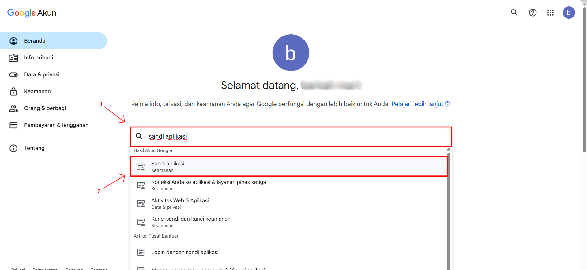 Untuk mendapatkan Sandi Aplikasi, buka Google Account, cari di kolom pencarian Sandi Aplikasi.
