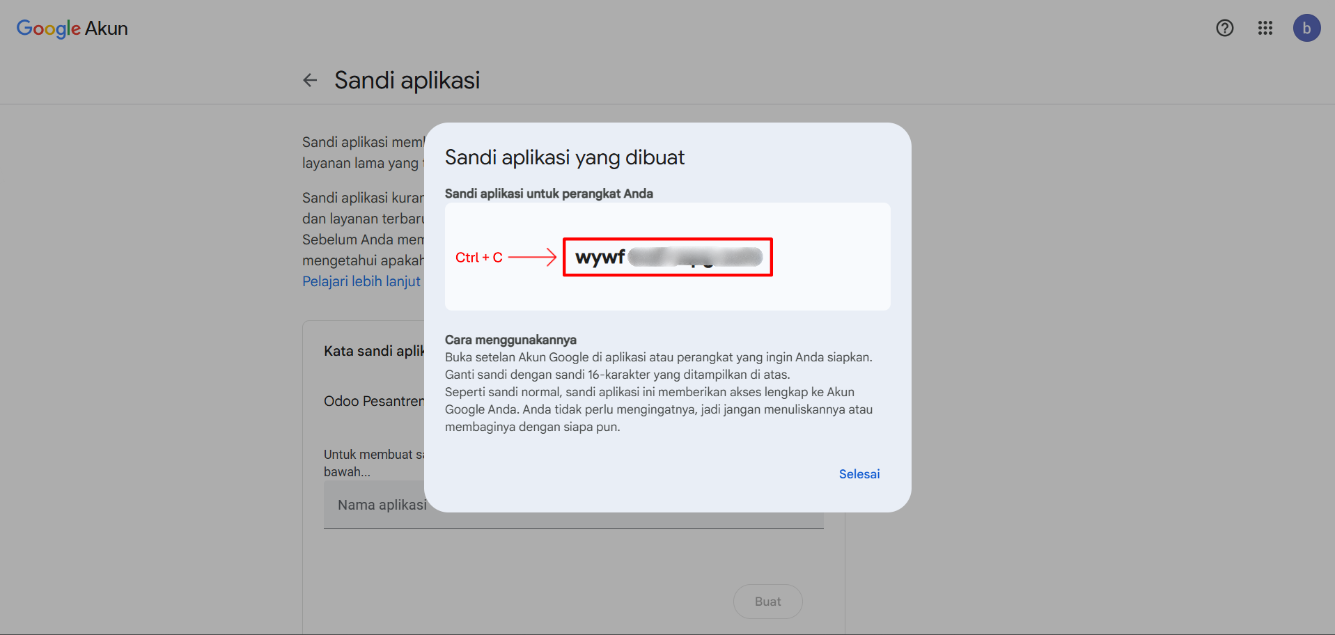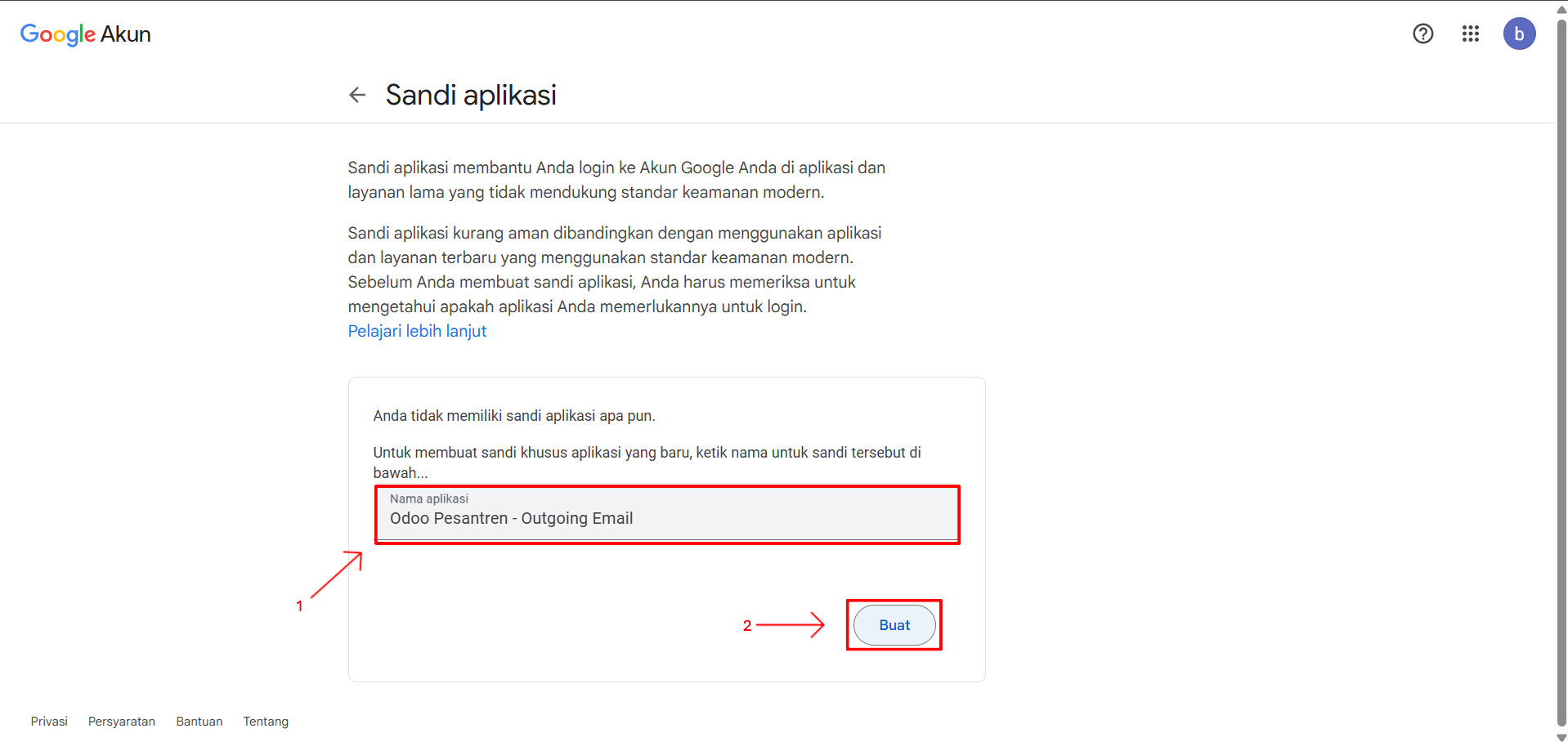 Lalu buat sandi aplikasi baru (misalnya: Odoo Pesantren – Outgoing Gmail), setelah isian terisi klik tombol "Buat" untuk membuat Sandi Aplikasi.