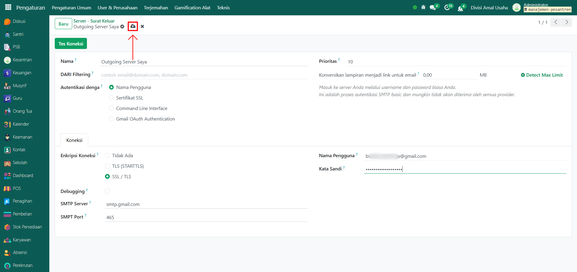 Klik icon Simpan di sebelah kanan icon Gear agar server SMTP Gmail tersimpan di sistem.
